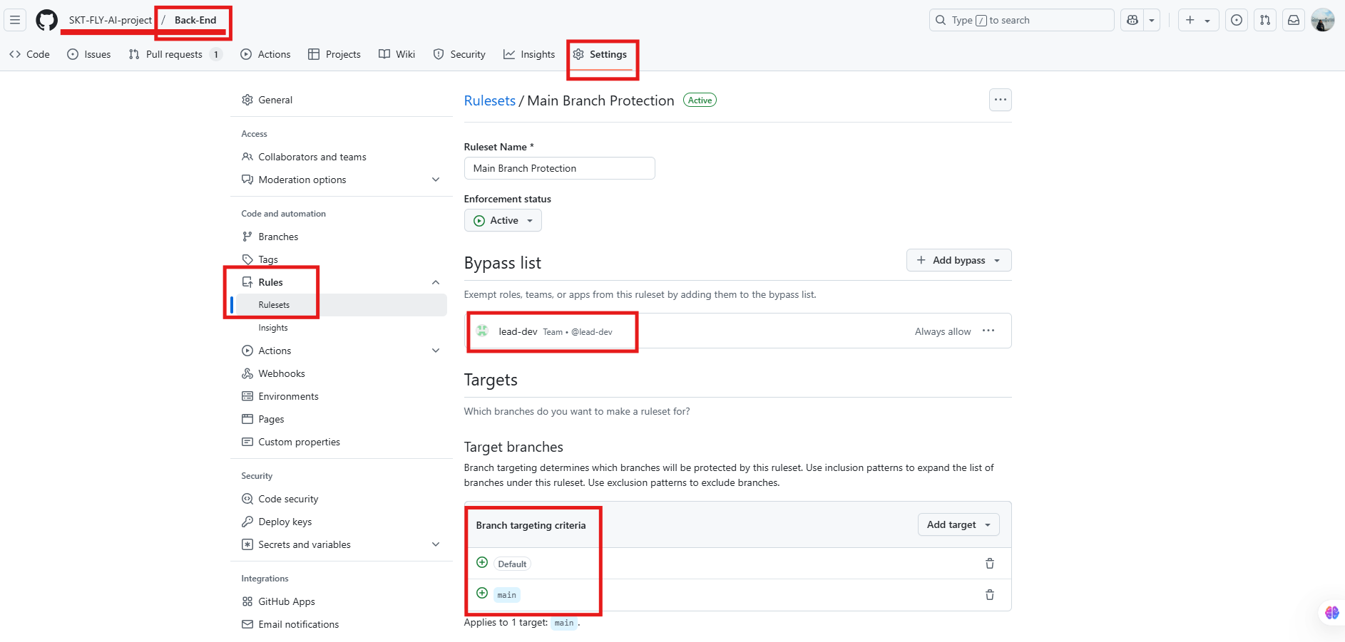- "Required approvals" (필수 리뷰 설정) 확인
