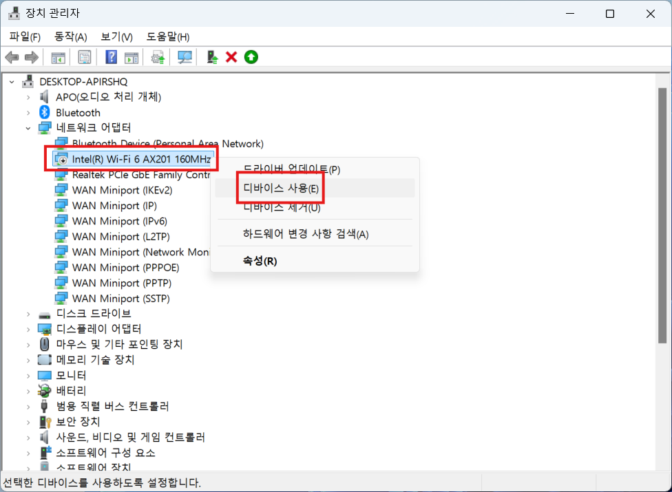 다시, 자신 노트북 Intel Wi-Fi '우클릭' >