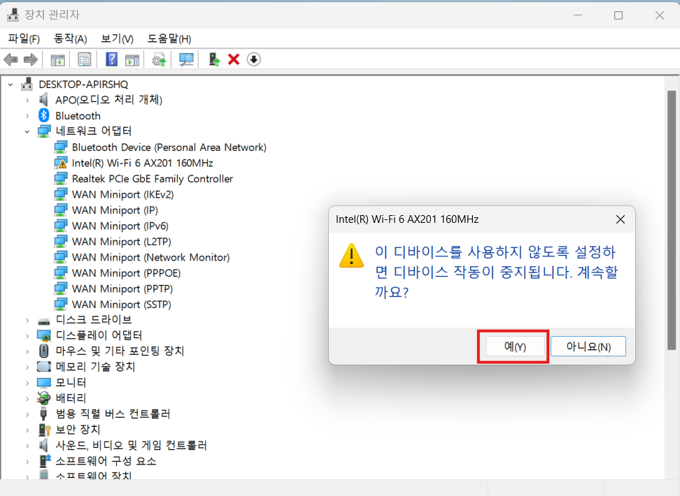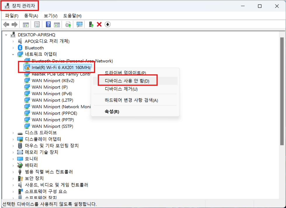 장치관리자 > 자신 노트북 Intel Wi-Fi '우클릭' >