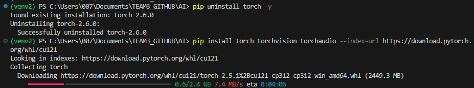 pip uninstall torch -y pip install torch torchvision torchaudio --index-url https://download.pytorch.org/whl/cu121