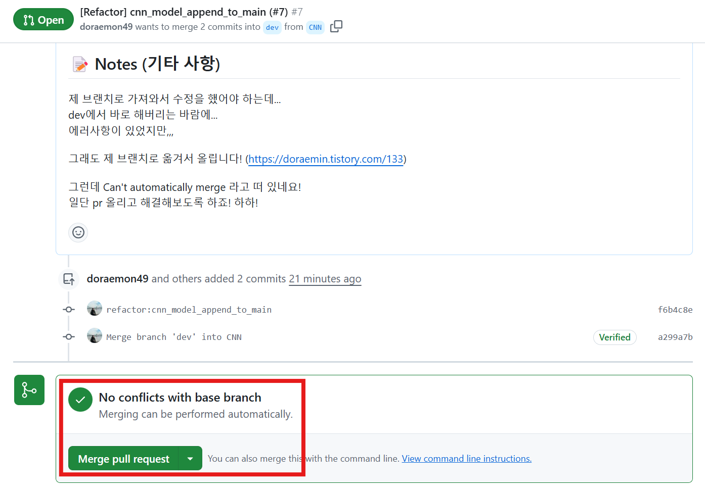 내 브랜치에 올렸고, 이제 dev로 올리기 위해 merge 하려니..