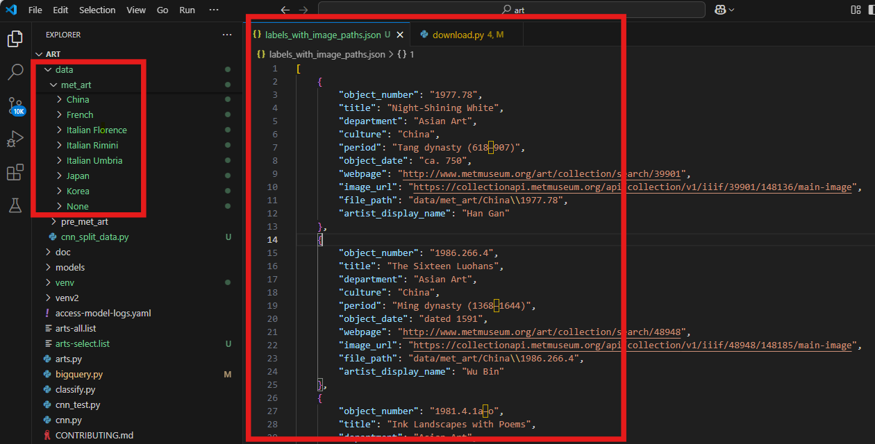 Metropolitan Museum of Art의 예술 작품 이미지를 웹에서 자동으로 다운로드하고, 메타데이터를 JSON 파일에 저장. 이 과정에서는 Selenium을 사용해 웹페이지를 탐색하며, urllib을 통해 이미지를 다운로드합니다.