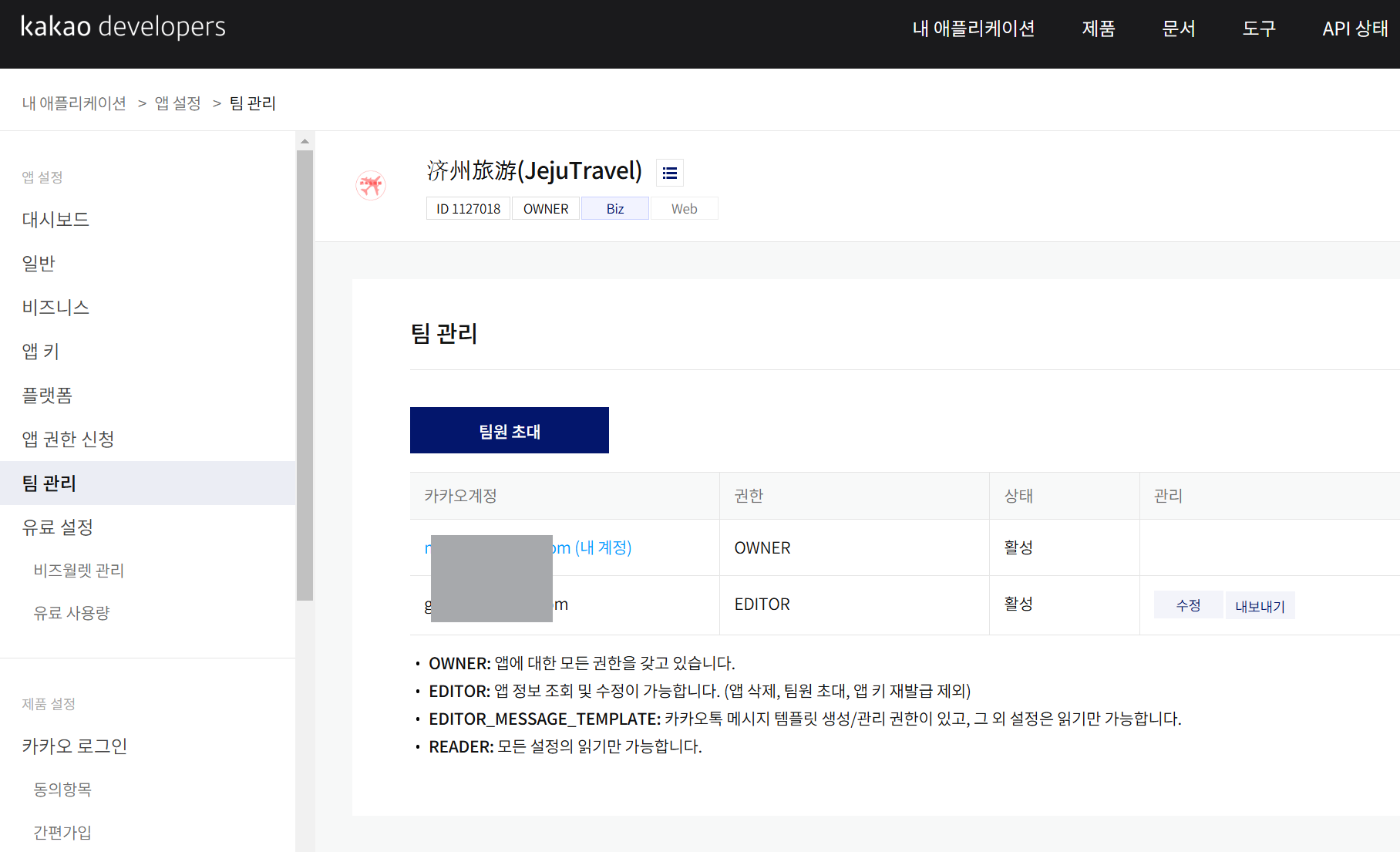 비즈니스를 받기 전에는, 내가 'kakao developers 팀 관리'에 등록한 사람들에 한정해서만, 카카오 로그인이 가능하다.