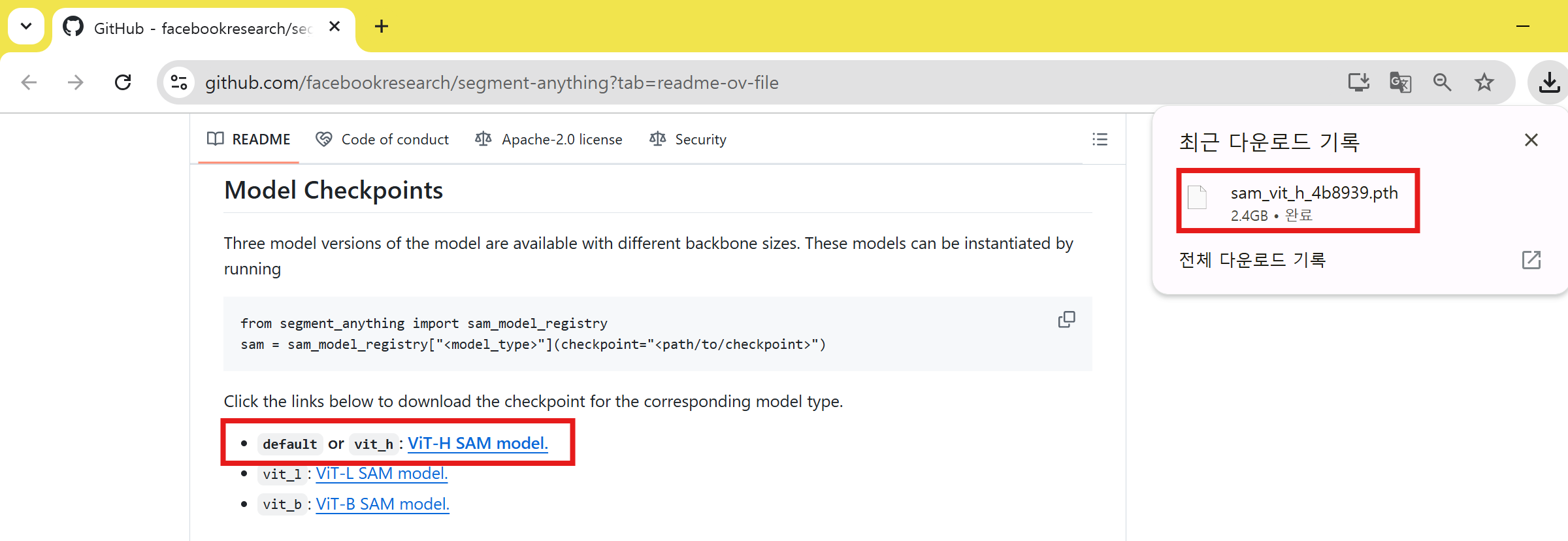 VIT-H SAM model 클릭하여 다운로드.