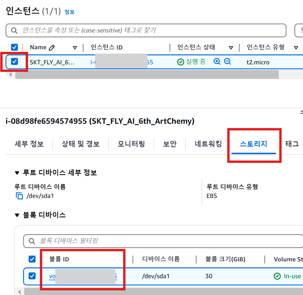 1️⃣ AWS 콘솔 → EC2 → 인스턴스 → 스토리지 탭으로 이동