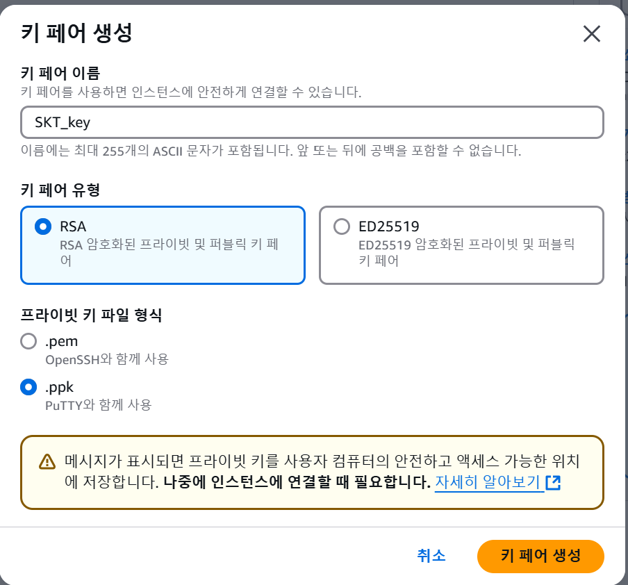 - 키페어( .ppk 파일) 다운로드