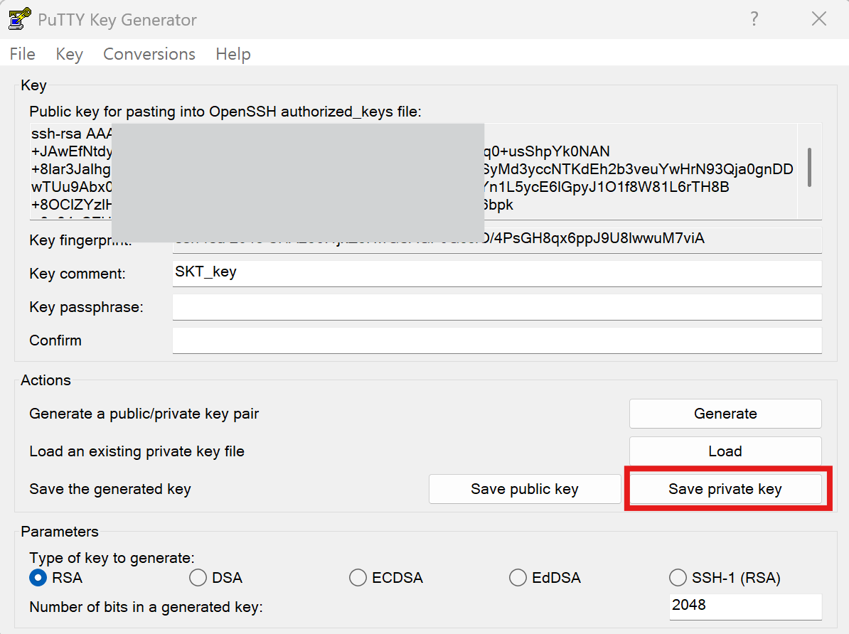 다운 받았던 .ppk 키로 private key를 생성하자.