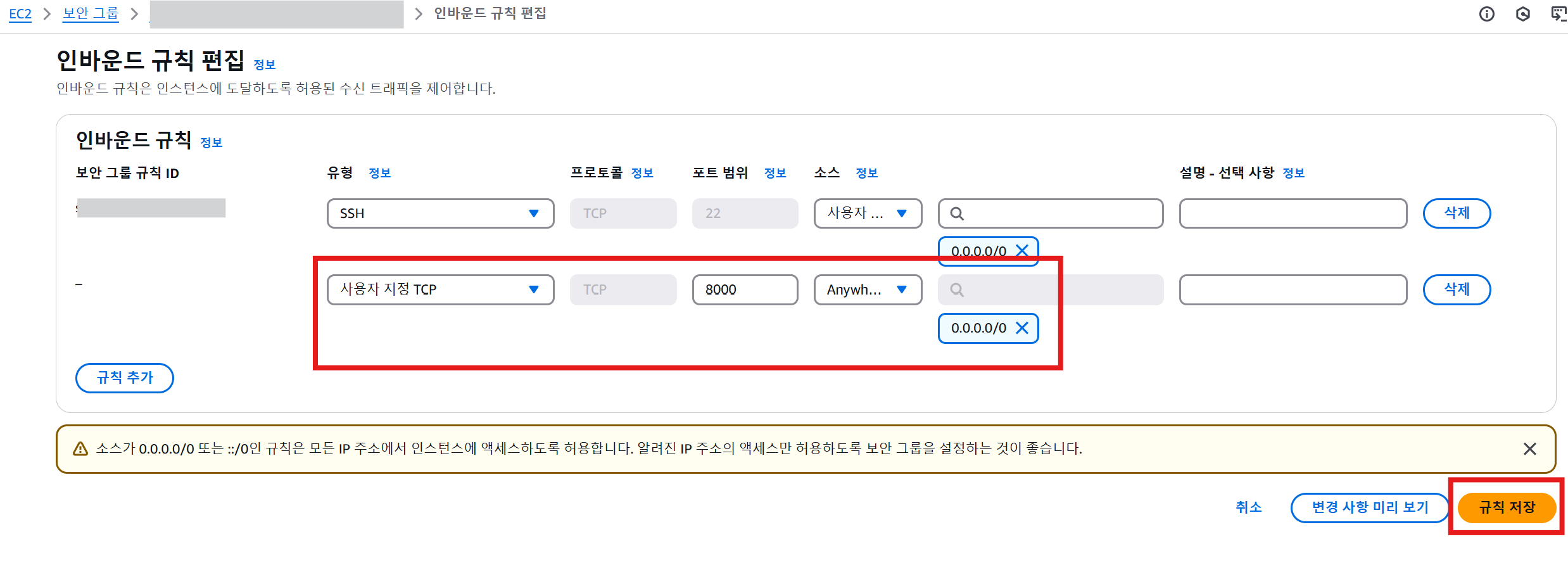 - 소스: 0.0.0.0/0 (공개 테스트용)