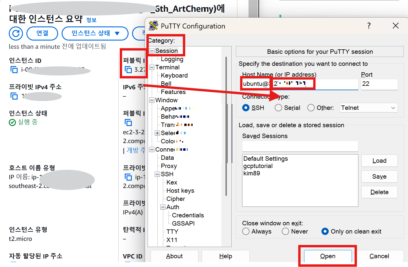 Open! (Open 누르기 전에 Saved Sessions 해놓으면, 내용이 저장된다. 그럼 다시 접속할 때, 처음처럼 key나 Host Name을 다시 입력해주지 않아도 된다! 저장해놓은 이름 누르고 Open하면 된다!)