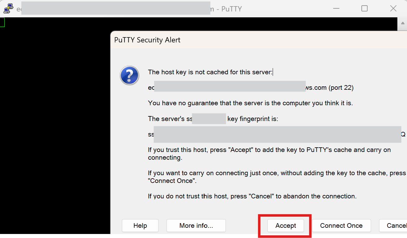 - **"Accept"**를 클릭하면 해당 서버의 SSH 키가 PuTTY에 저장되고, 이후 연결할 때 더 이상 경고가 나타나지 않습니다.