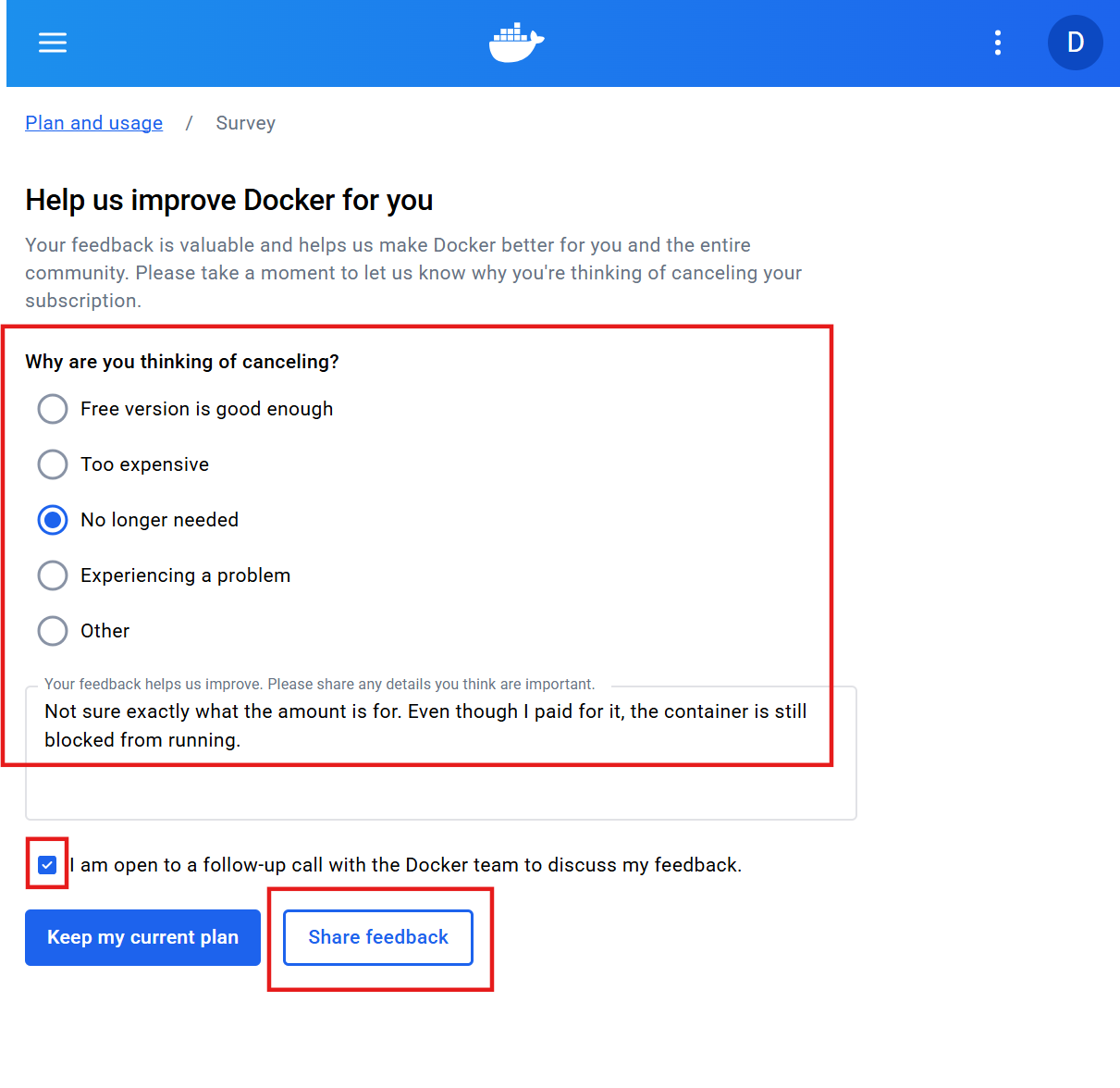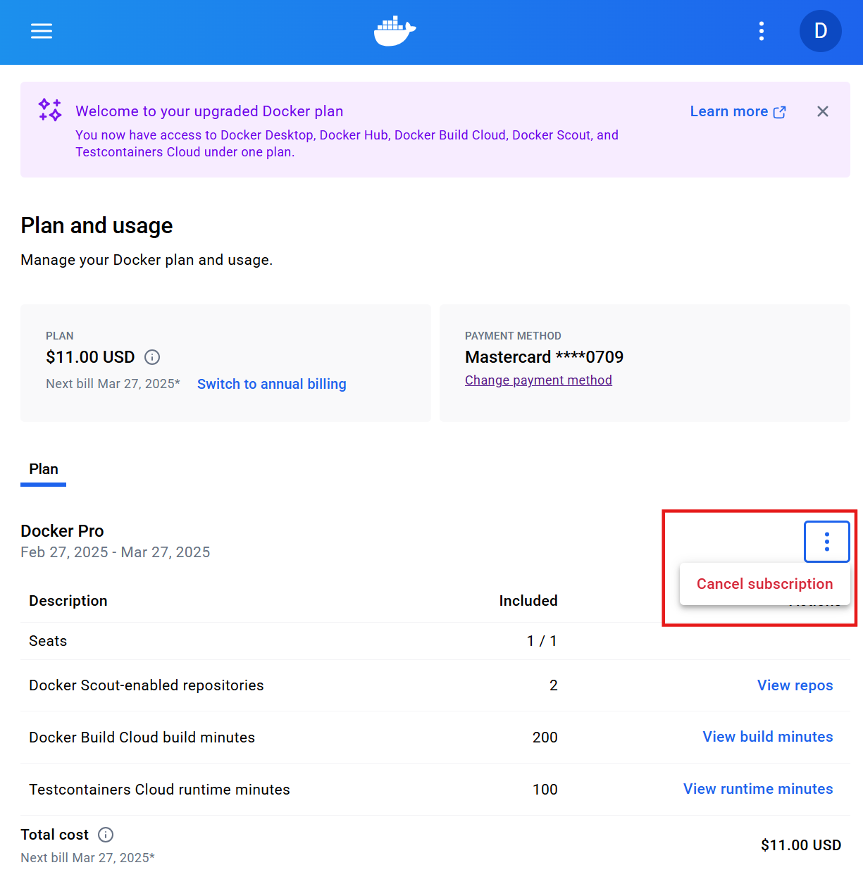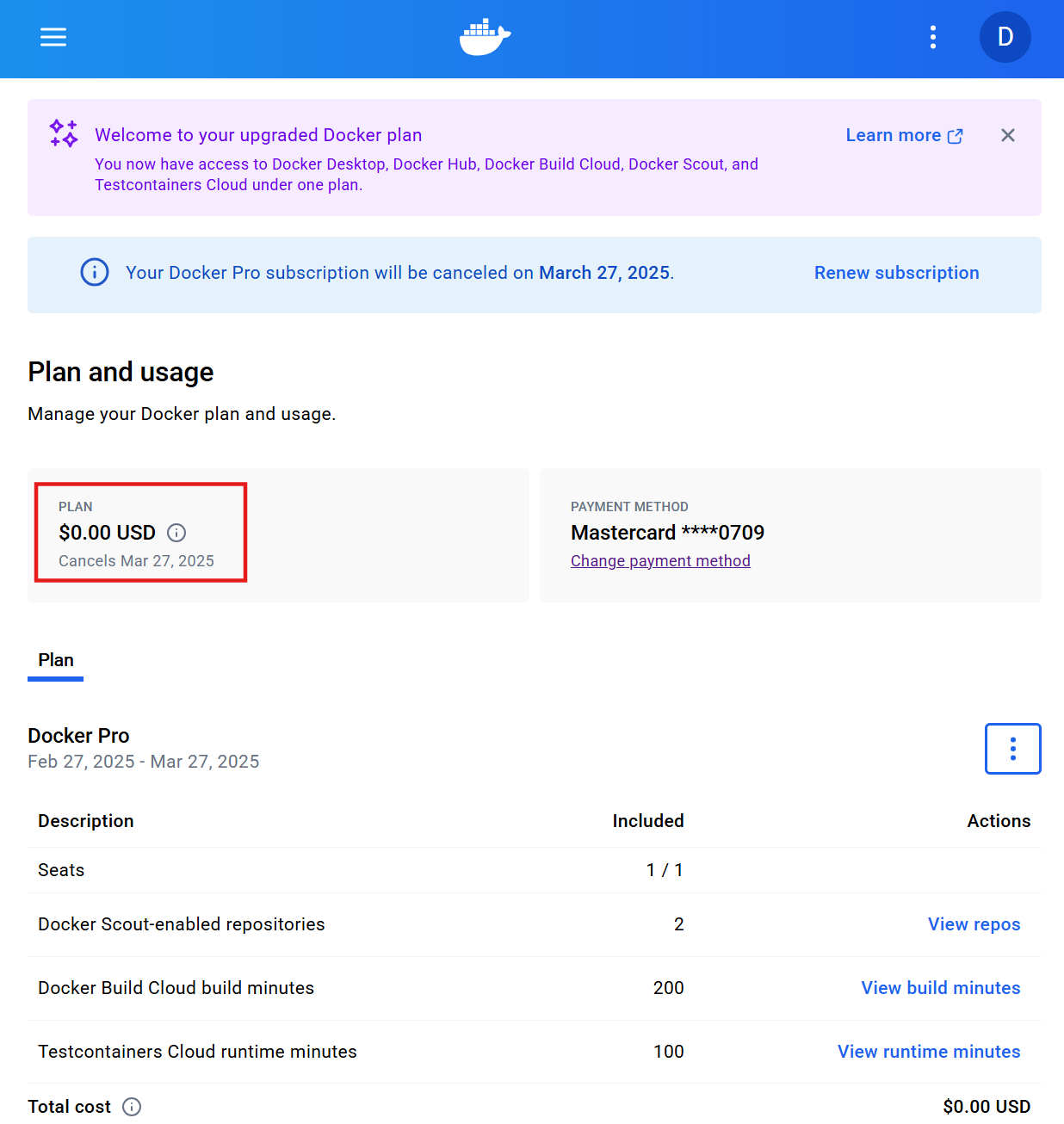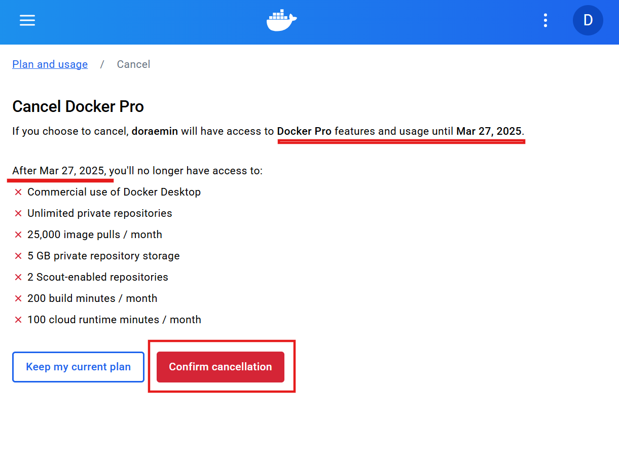 이미 금액 결제를 했던 내용은 그대로 유지된다. 즉, 이번달까지는 Docker Pro 계속 이용 가능하다. (이번달 환불 안됨,,,)