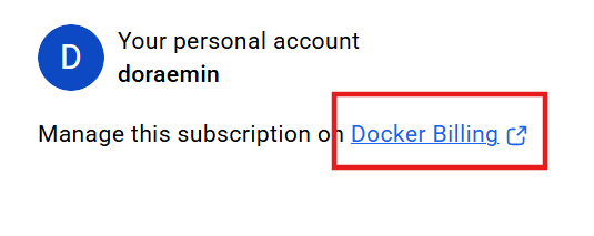 Manage this subscription on Docker Biling 클릭
