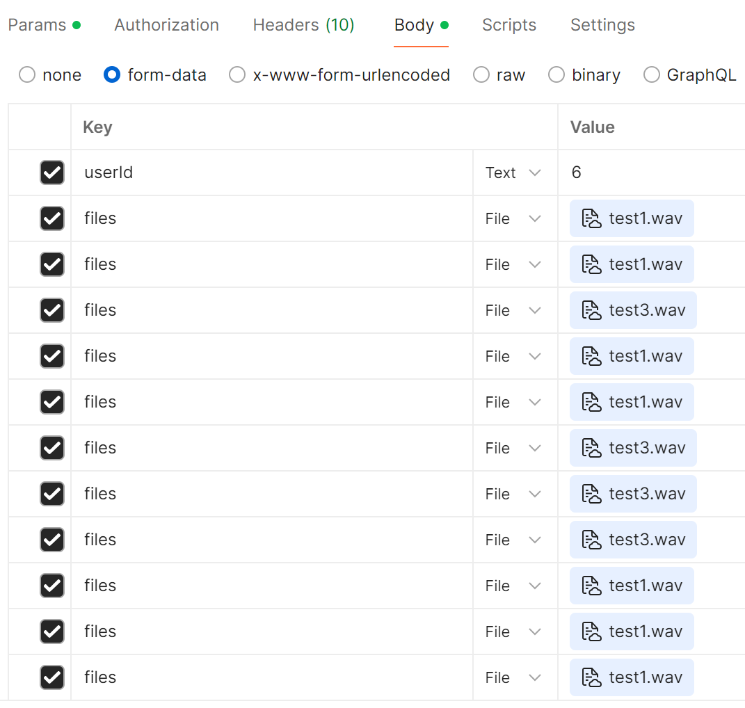 {"detail":[{"type":"missing","loc":["body","userId"],"msg":"Field required","input":null},{"type":"missing","loc":["body","files"],"msg":"Field required","input":null}]}