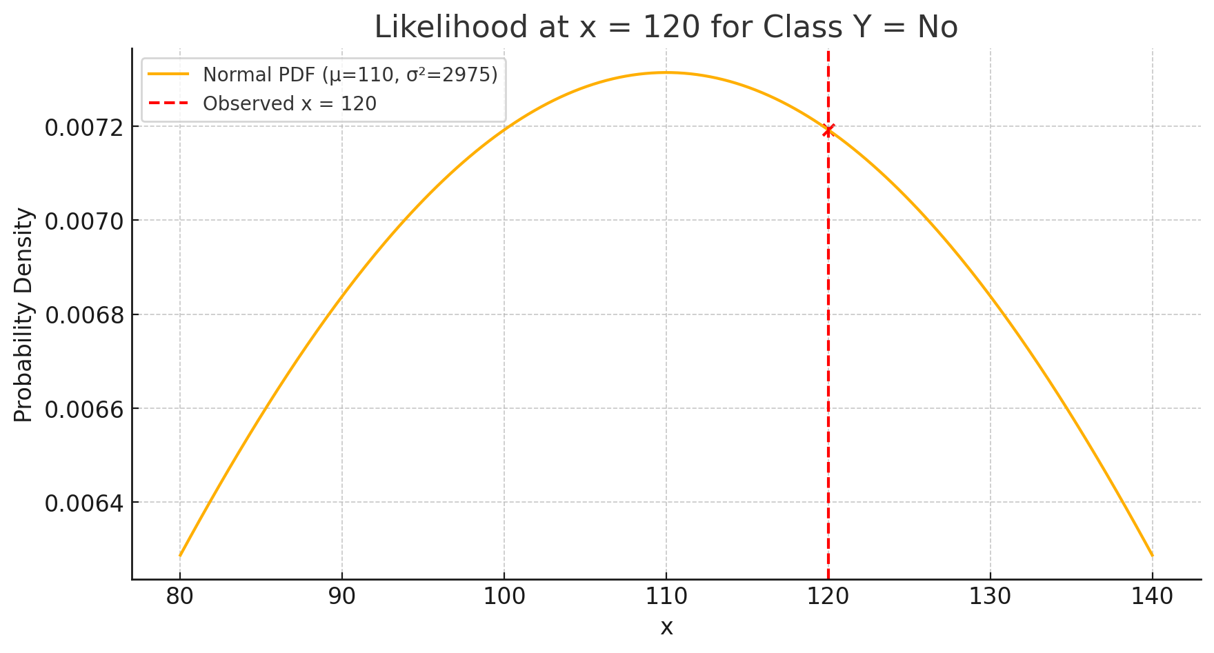 이때 관측값 $x = 120$ 에서의 우도(likelihood) 값은 다음과 같이 계산됩니다: