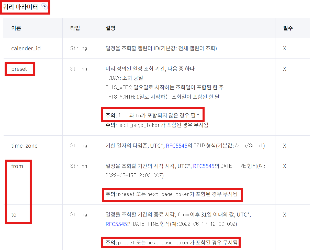 주의: preset 또는 next_page_token가 포함된 경우 무시됨 ⇨ preset 또는 next_page_token이 없는 경우에는, from과 to 기입해주자.