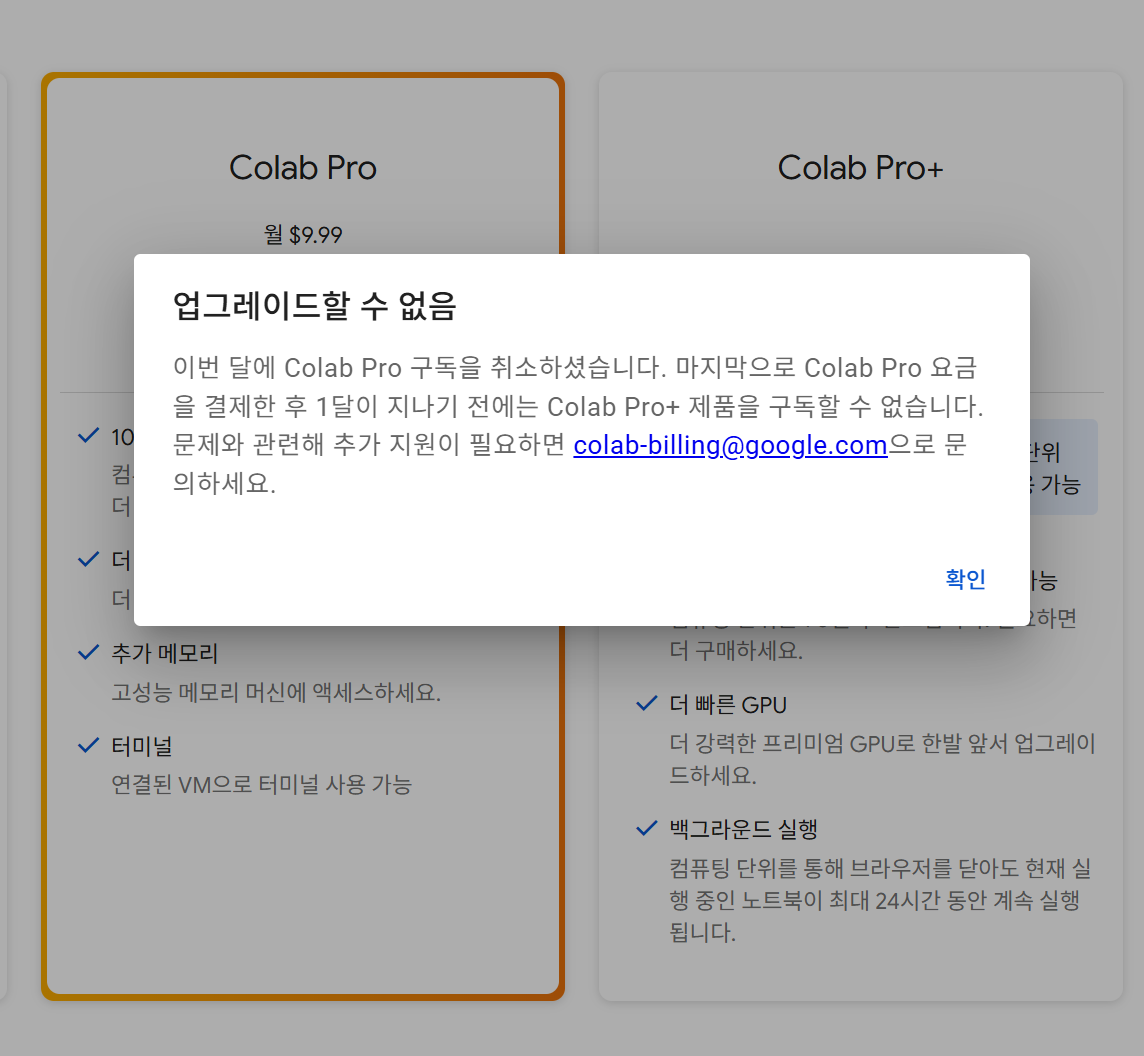 그래서 고민 끝에 Colab Pro+를 결제하려는데,, 안된단다 ㅠ