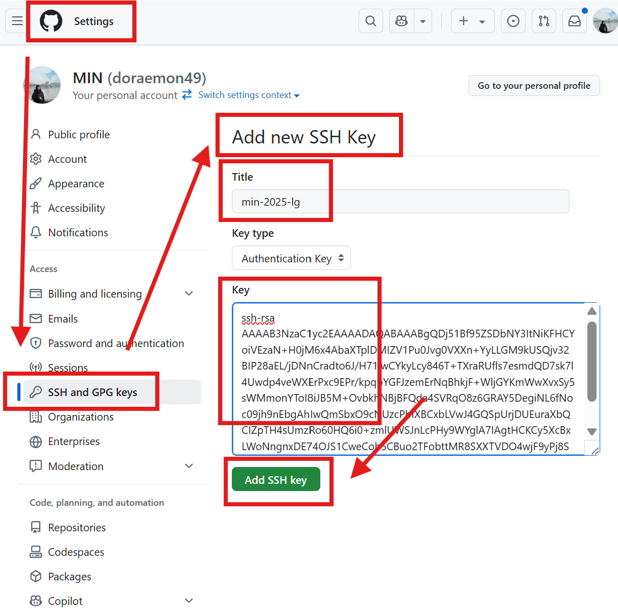 방금 생성한 'id_rsa.pub'를 열어서, 복붙해주면 된다.