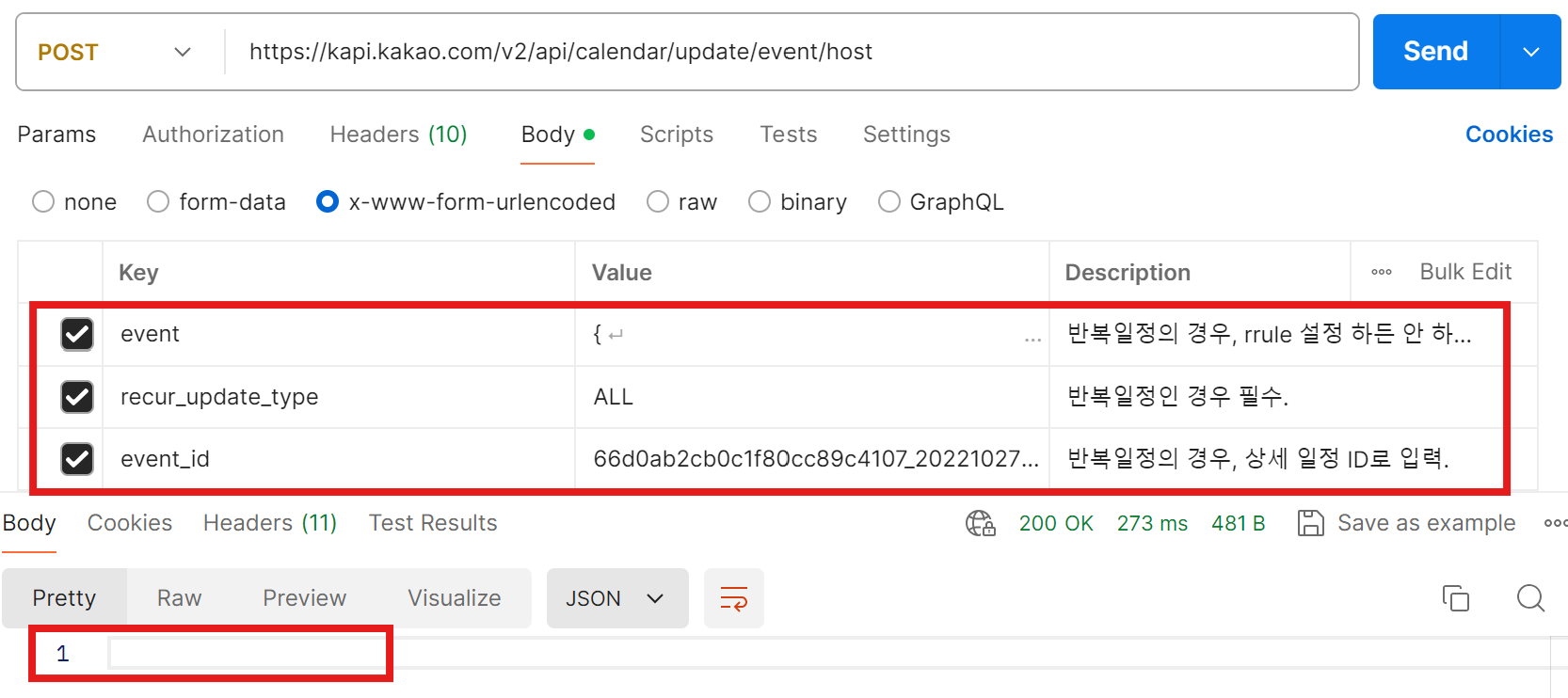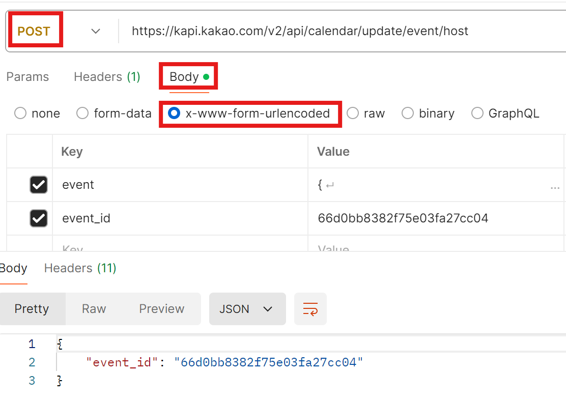 POST로 url을 입력해주고 https://kapi.kakao.com/v2/api/calendar/update/event/host