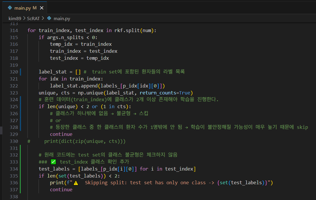 또한, label별 환자 수 균형이 맞지 않다면 일부 split에서 클래스가 하나만 포함되는 테스트셋이 만들어질 수 있습니다.