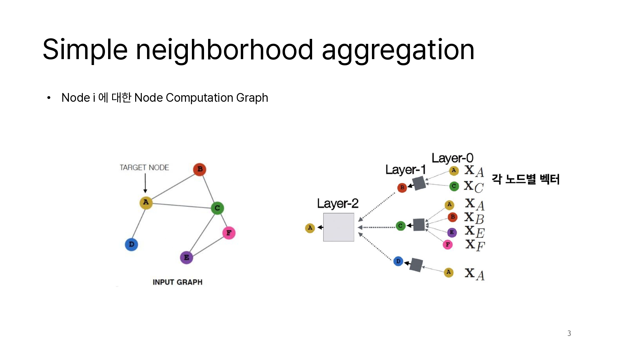 Simple neighborhood aggregation 개념을 바탕으로attention을 적용한, Graph Attention Network (GAT) 의 구조를 살펴보자. Simple neighborhood aggregation Simple neighborhood aggregationNode i 에 대한 Node Computation Graph $h_v^k$ : **노