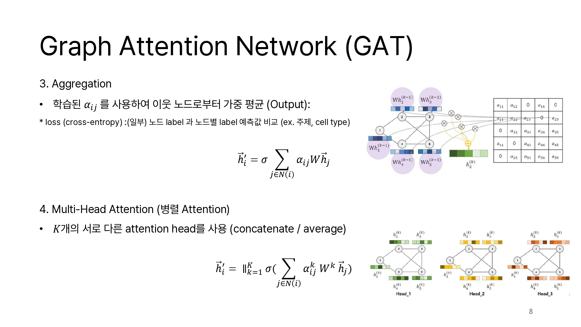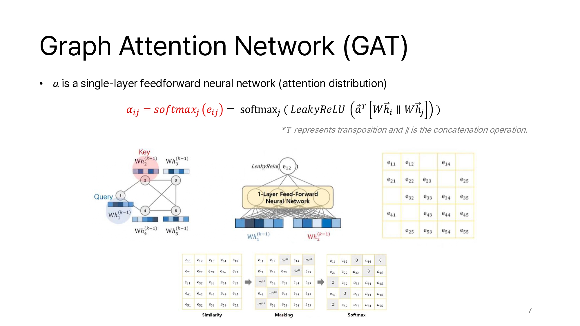 GAT에서 self-attention이 사용되긴 하지만, Transformer-style의 Key/Query/Value (KQV) 구조와는 다르게 간단화된 형태입니다.하지만 그럼에도 불구하고 우리가 익숙한 K/Q/V 해석 관점에서 대응 관계를 살펴볼