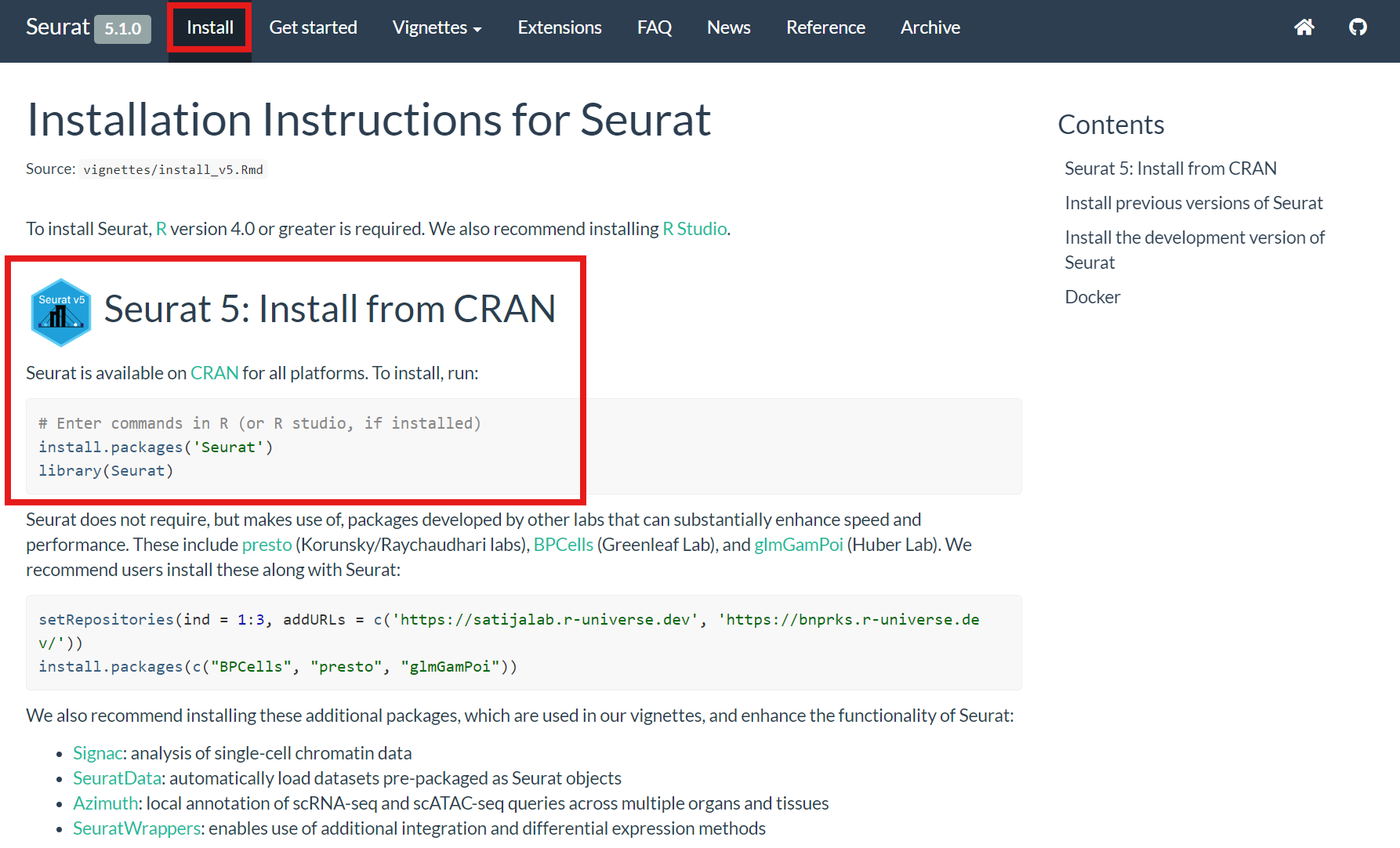 Seurat 공식 사이트의 'install' 부분의 코드 작성
