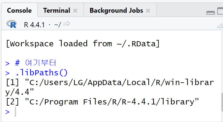 .libPaths() 로 확인해보면 R-4.1.3과 R-4.4.1 두 가지 버전 다 등록 되었다.