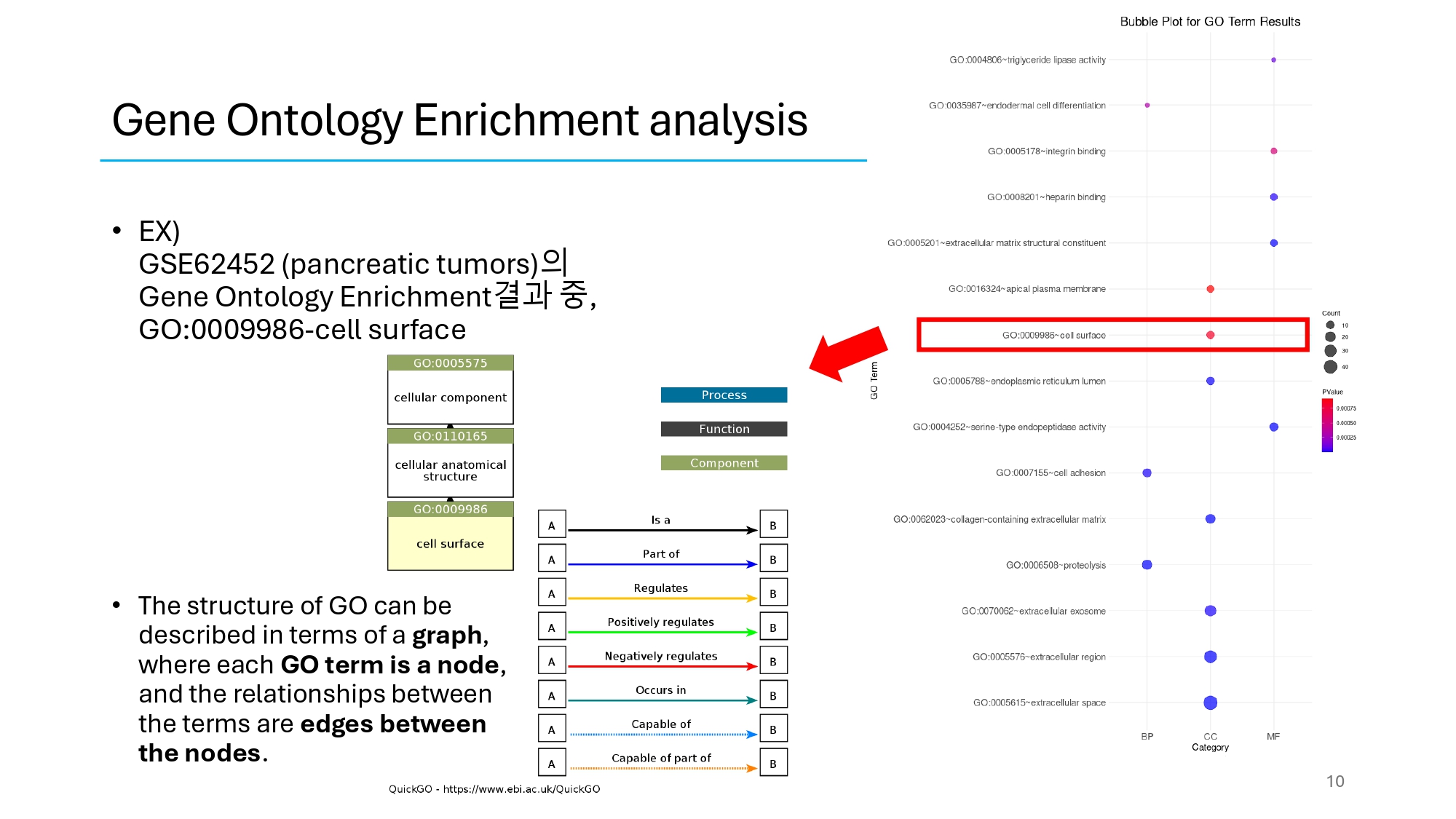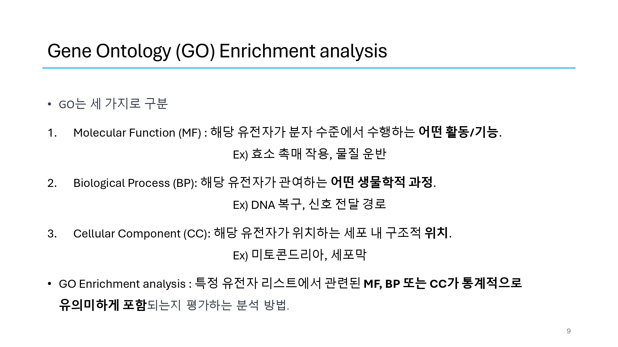 • GO Enrichment analysis : 특정 유전자 리스트에서 관련된 MF, BP 또는 CC가 통계적으로 유의미하게 포함되는지 평가하는 분석 방법.