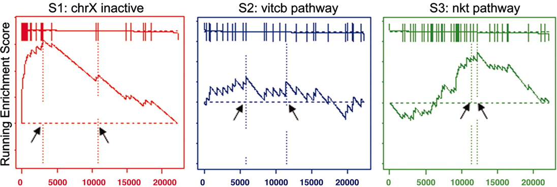 •S3, related to chemokine receptors expressed by T helper cells. ⇒ S3 is not enriched at the top of the list but is nonrandom, so it scores well.