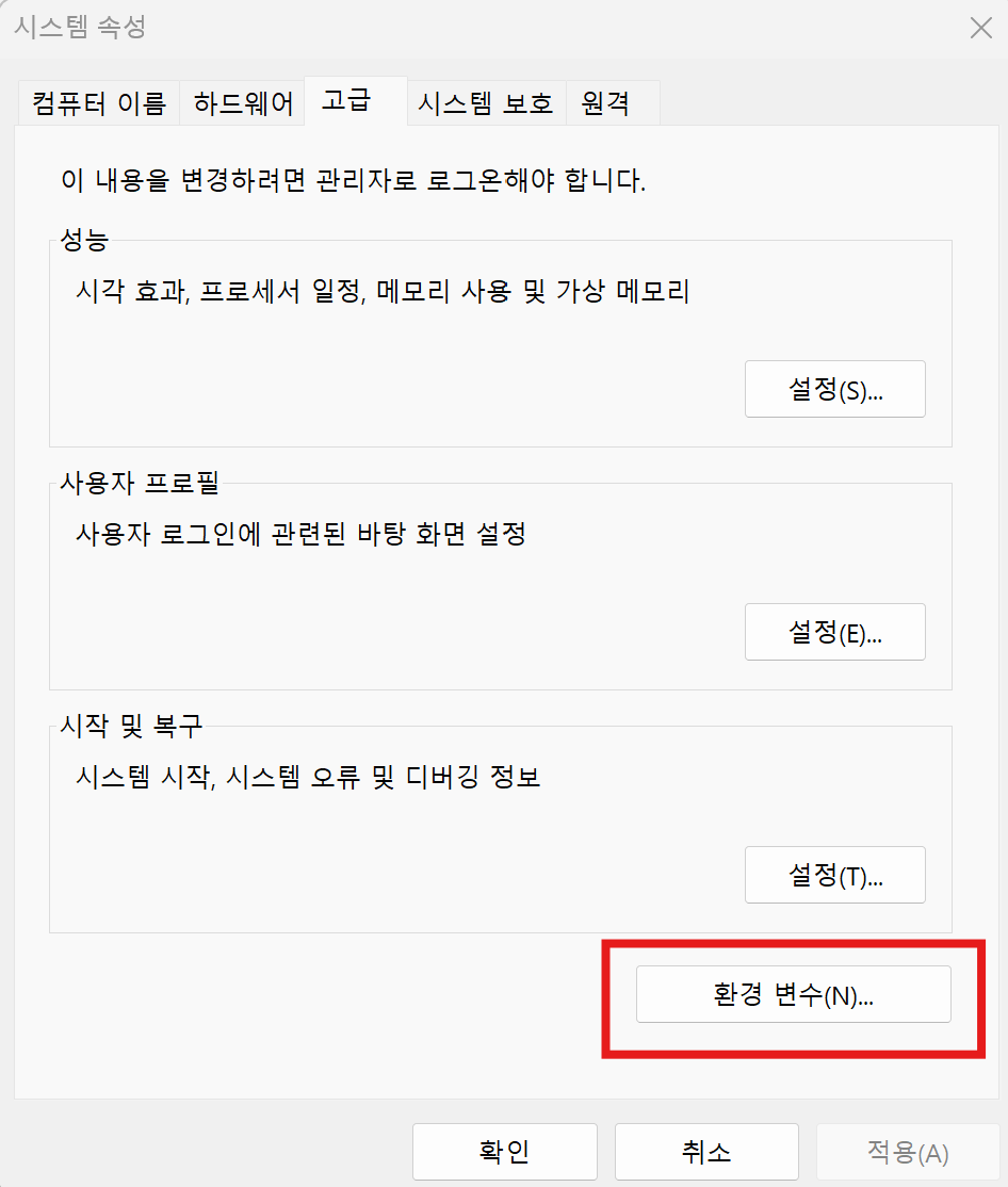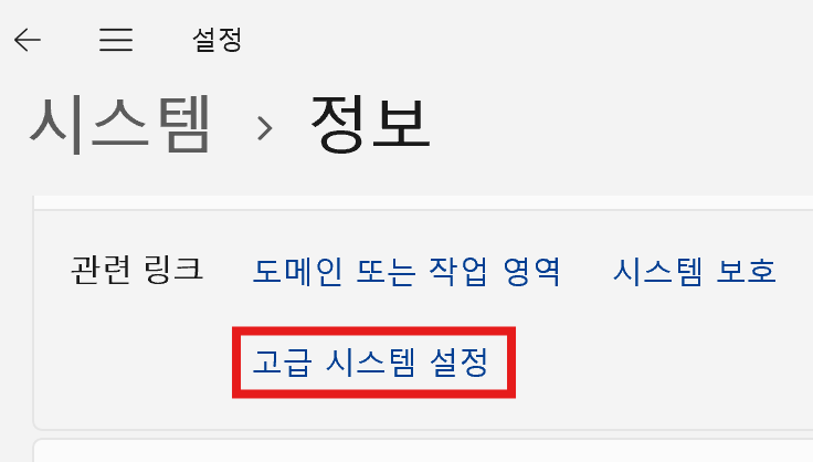 설정 > 시스템 > 정보 > 고급 시스템 설정 >