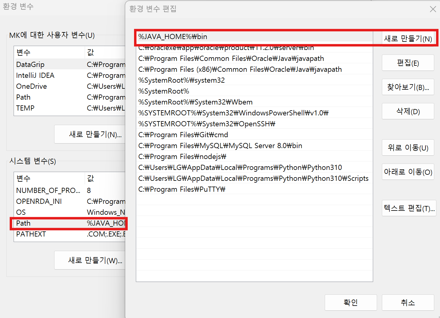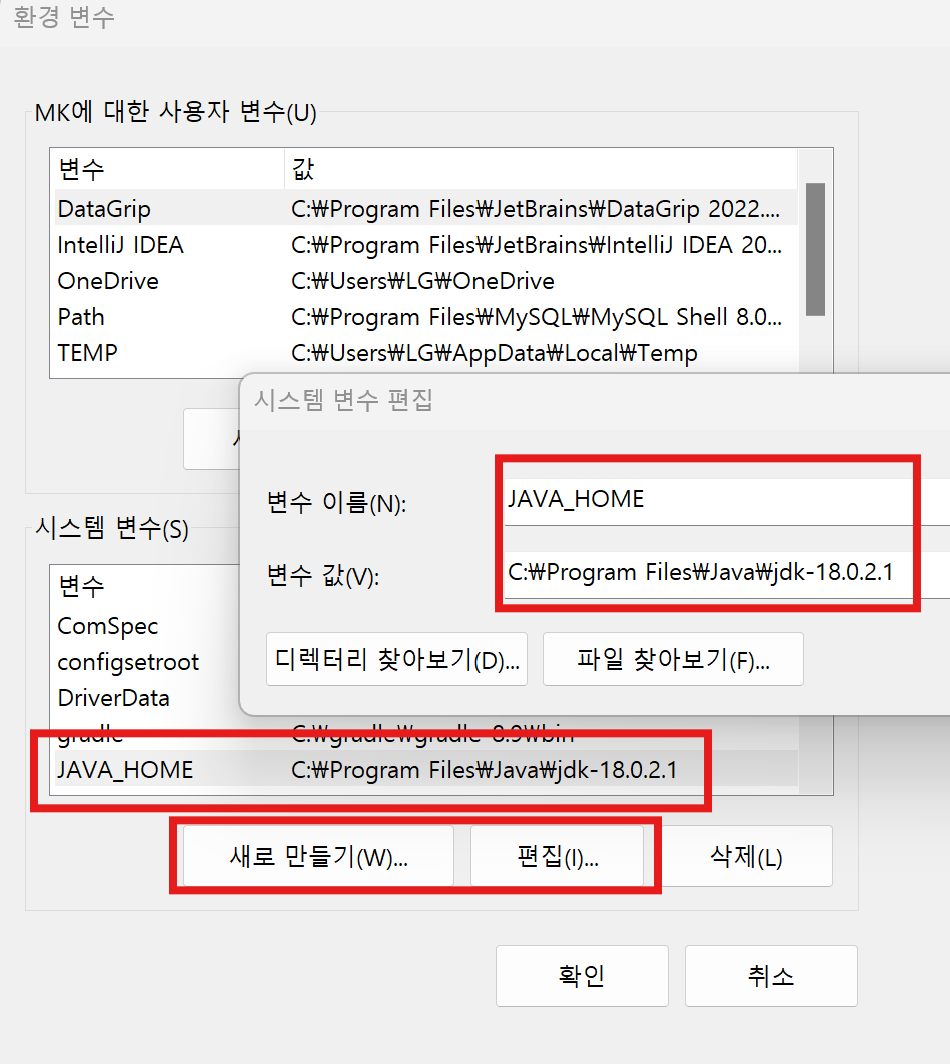 버전 변경이라면) JAVA_HOME 클릭 후 편집