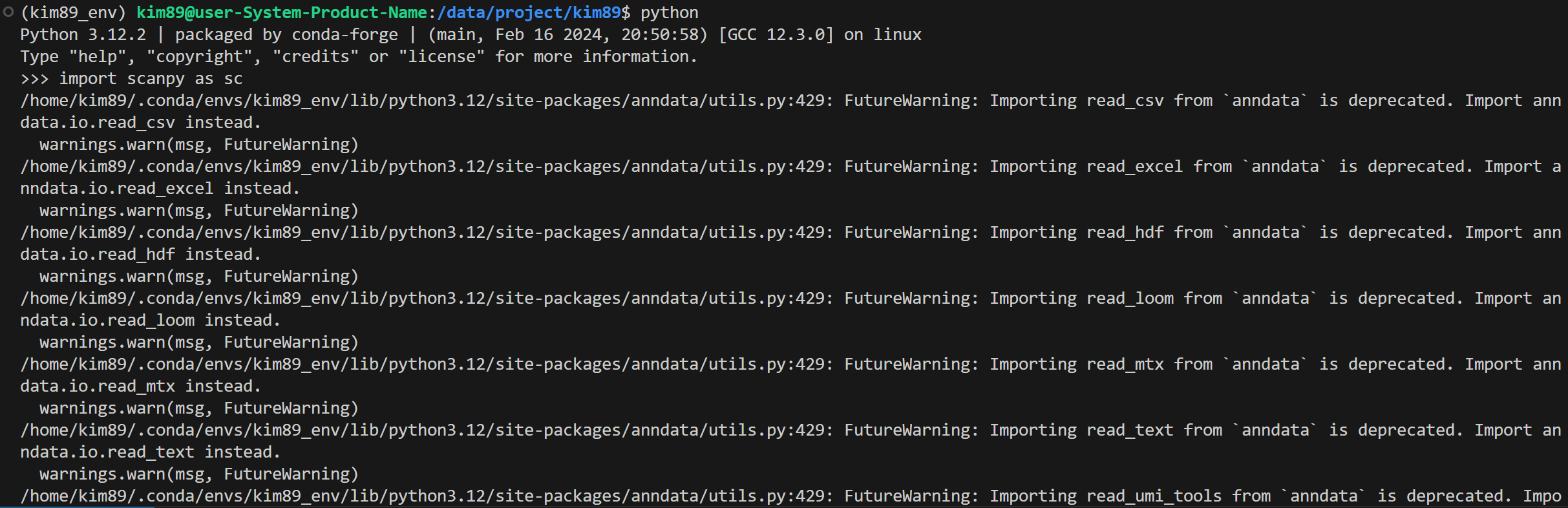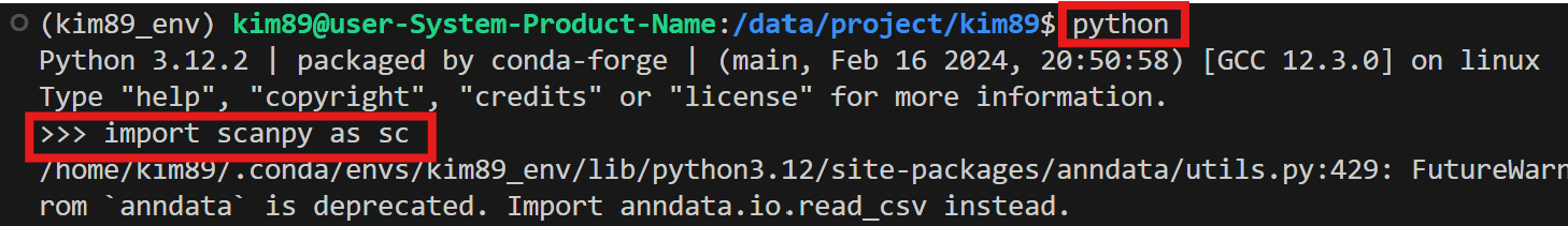 설치 후 터미널에서 Python 인터프리터를 실행하고 Scanpy를 불러오기