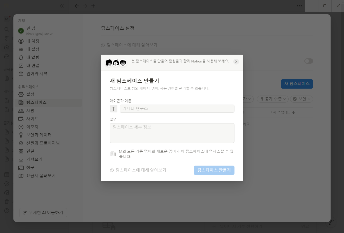 '팀스페이스' 를 클릭한 뒤, '새 팀스페이스'를 생성한다.