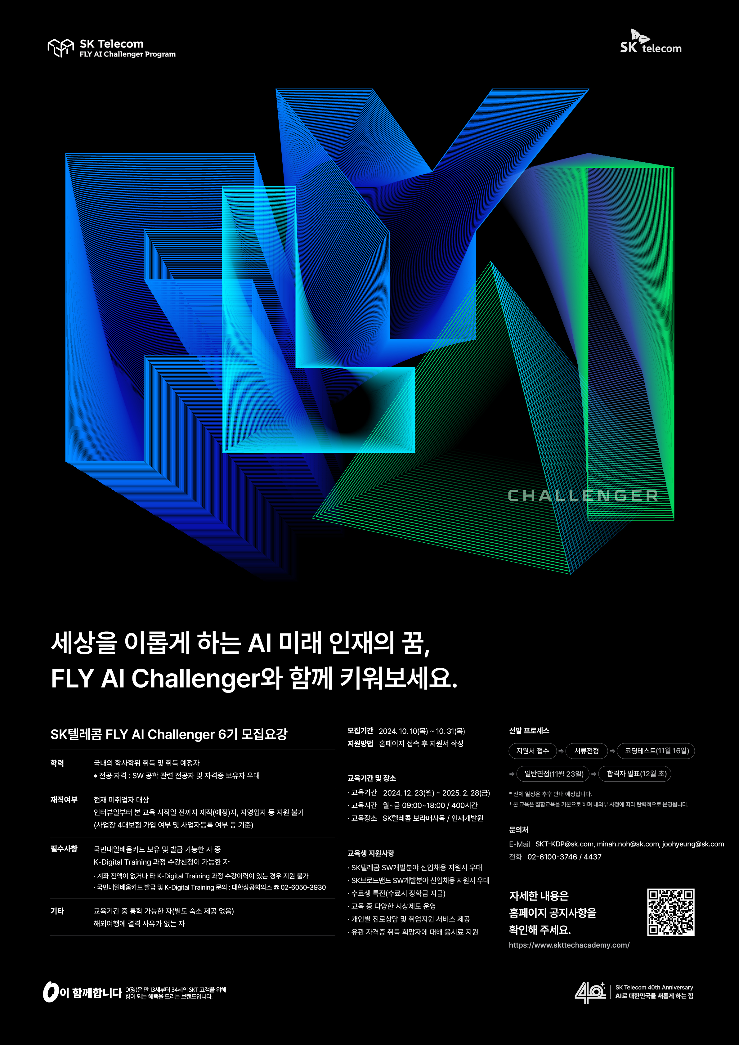 벌써 두여달이 지나고 수료식날이다...![SK텔레콤 FLY AI Challenger 6기] 지원 및 교육 [SK텔레콤 FLY AI Challenger 6기] 지원 및 교육SK텔레콤에서 매년 여름과 겨울 방학 동안 진행하는 AI 교육 프로그램인
